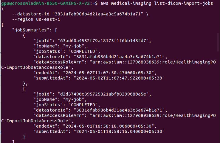 It will list the result of the image set extracted from the DICOM image imported into the AWS HealthImaging data store.